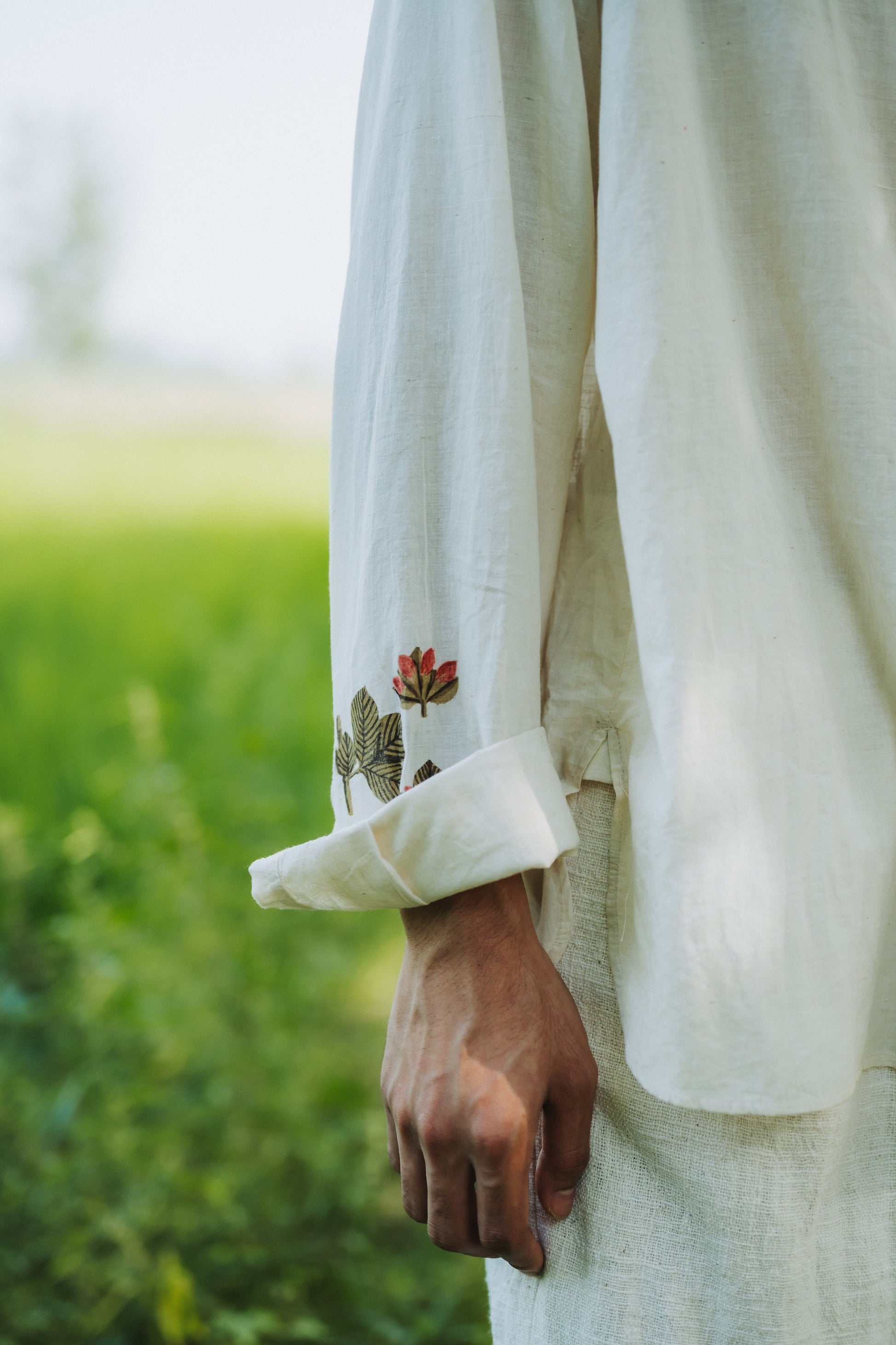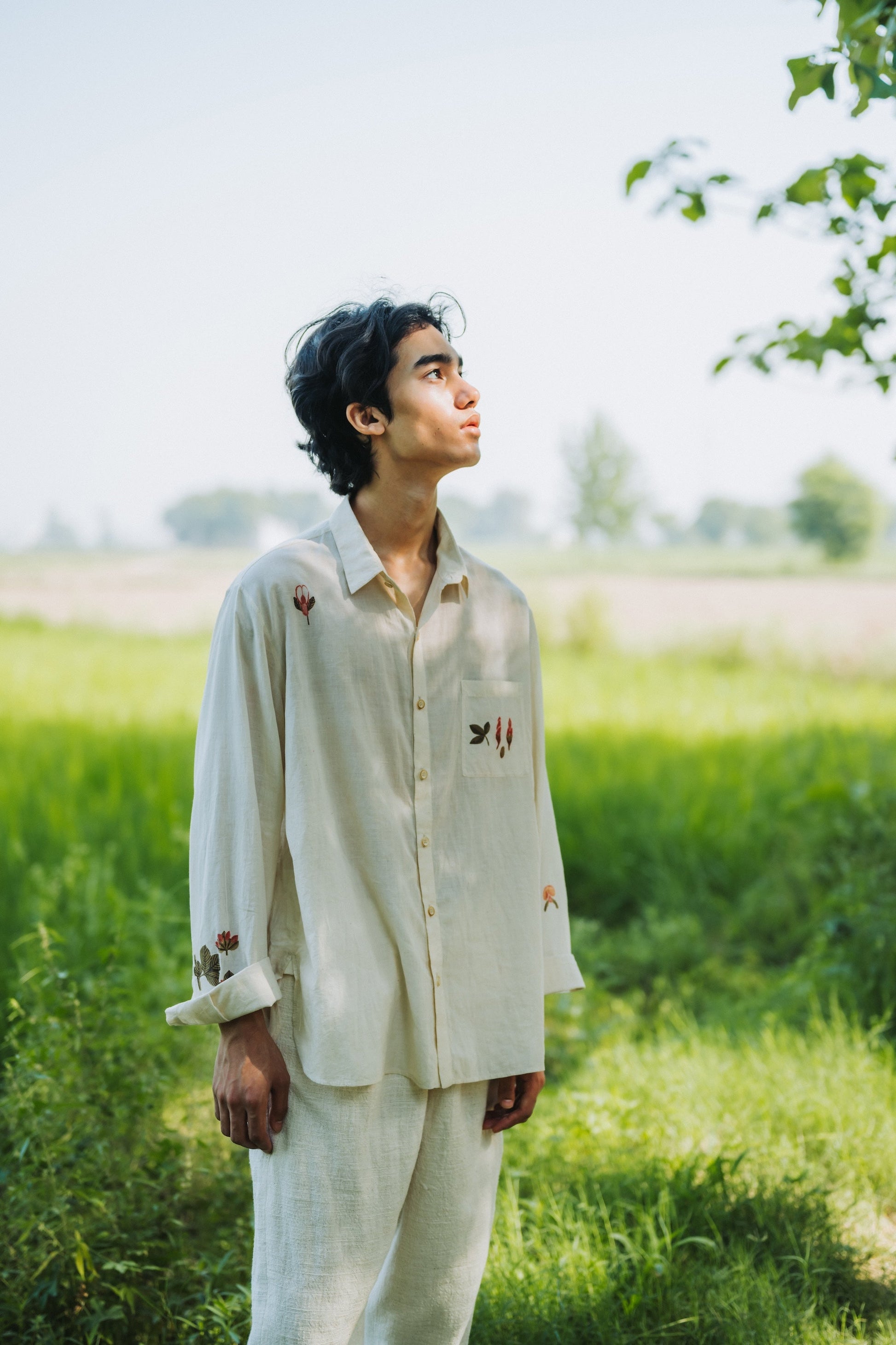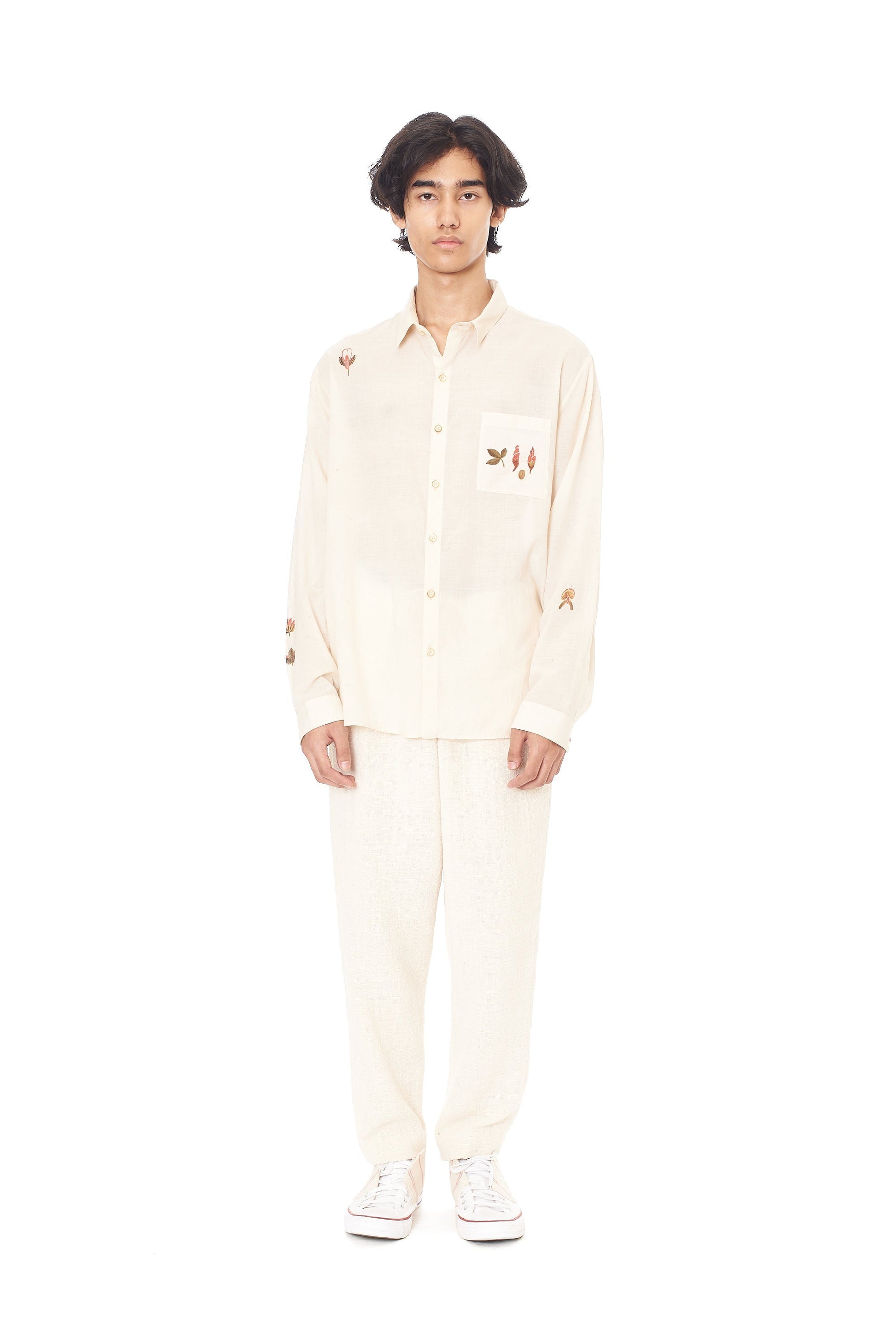 Unisex spread collar relax fit shirt. Crafted with fine cotton. Punctuated with delicate hand painted floral motifs carefully placed around the garment.